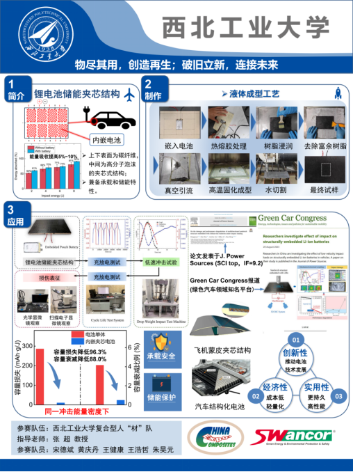 参赛作品“锂电池储能夹芯结构”旨在将能量存储和承载功能结合在一起,以提高能量储存效率和空间利用率,在相同冲击能量密度下,相比于不受保护的锂电池单体,该一体结构的容量损失减小了96%,容量衰减比例降低了88%,为未来交通工具和航空航天行业提供新型轻量化多功能结构方案。在成果展示环节,该作品的创新性、实用性、经济可行性得到了评委们的高度认可,最终,荣获创新应用奖二等奖。