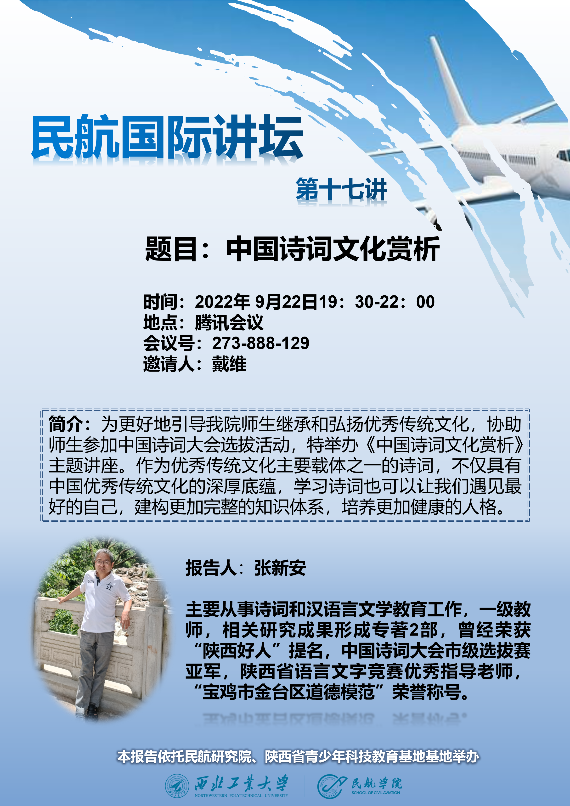 9月22日晚七点三十分,我院拟线上举办“中国诗词文化赏析”专题讲座,届时欢迎各位老师同学参会交流。讲座信息如下: