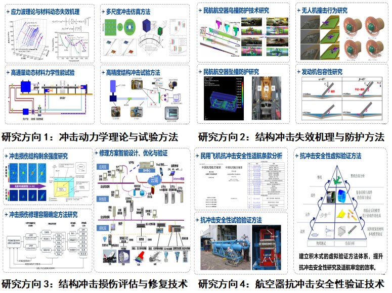 航空器的冲击防护与安全评估,涉及到材料和结构的冲击动力学基础理论,以及损伤评估、修复和适航验证等工程技术问题。实验室以提高民航航空器运行的安全性、经济性和可靠性为目标,从基础理论和工程应用两个层面出发,设立了冲击动力学理论与试验方法、结构冲击失效机理与防护方法、结构冲击损伤评估与修复技术、航空器抗冲击安全性验证技术四个研究方向。