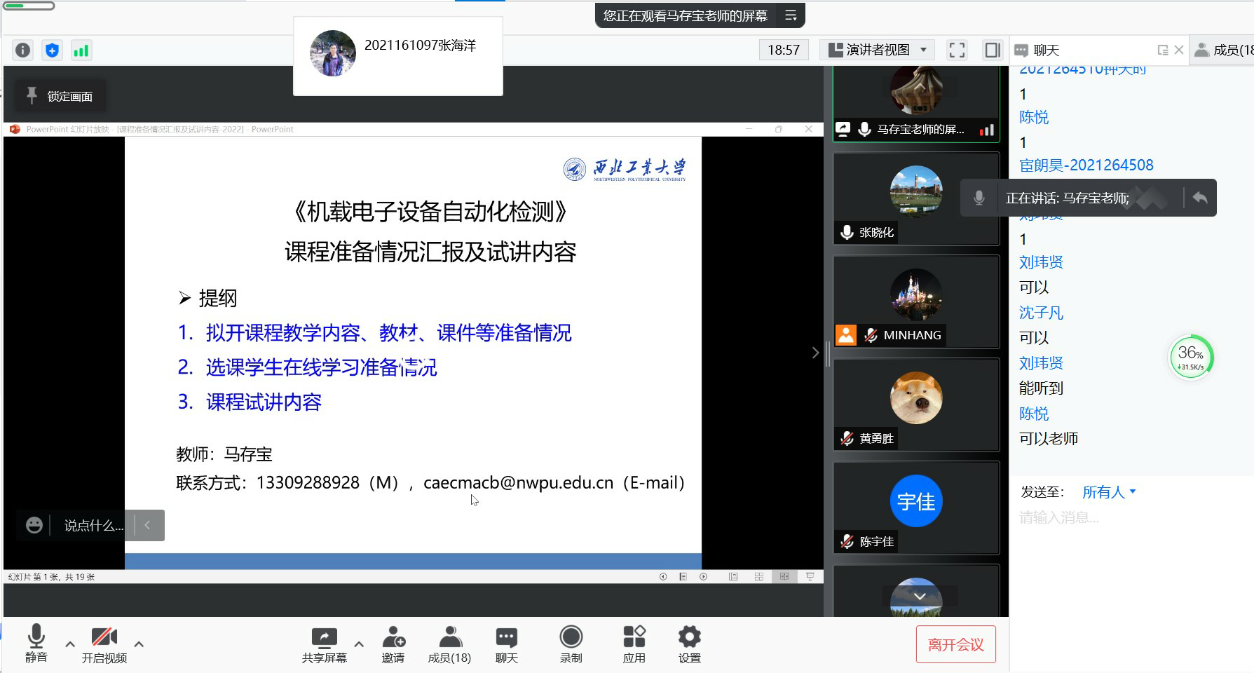 教学督导组、任课教师及教学办公室工作人员参加,同时参加会议的有选课的学生和其他有关人员。会上共同学习了2021-2022学年春季学期研究生线上教学工作实施方案,并请任课教师试讲演练,对发现的问题及可能出现的问题及时处理,保证研究生教学工作在非常时期稳步、高质量的完成。